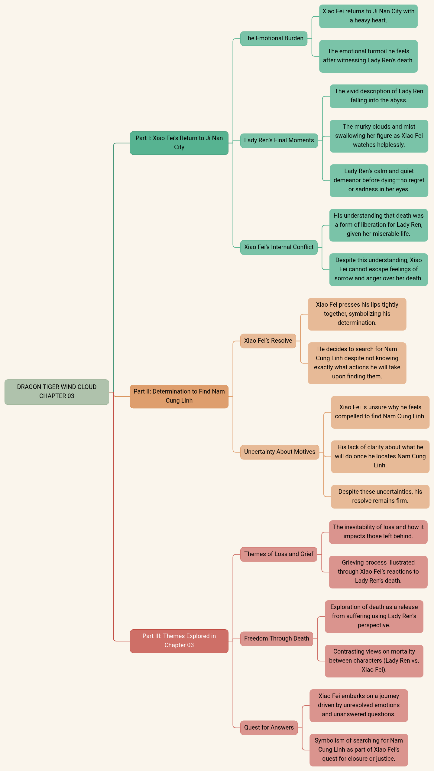 - Contrasting views on mortality between characters (Lady Ren vs. Xiao Fei).